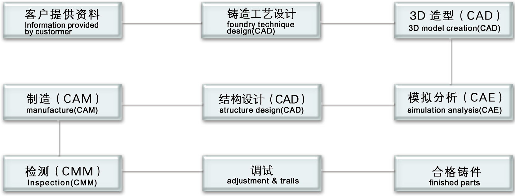 高素質(zhì)科技隊伍,一流的熱成型、高壓、重力、低壓及黑色鑄造工藝設(shè)計、 模具結(jié)構(gòu)設(shè)計人員,利用UG CATIA CREO AUTOCAD MAGMA FLOW-3D CIMATON LK/DIMS5.5 METRIS SCCAN4.2等設(shè)計、模擬、加工、檢測軟件,為制造一流的鑄造模具提供技術(shù)保障。